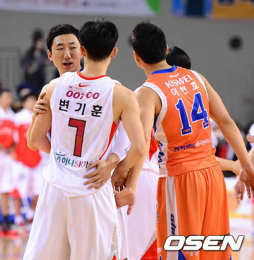 경기 종료 후 전자랜드 이현호가 변기훈과 인사를 나누고 있다./sunday@osen.co.kr