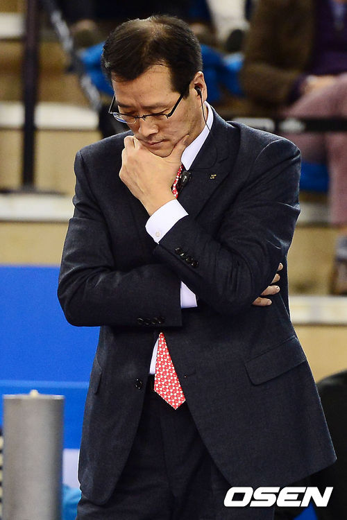 4세트에서 따라잡힌 LIG손해보험 문용관 감독이 아쉬움에 고개를 떨구고 있다. / rumi@osen.co.kr