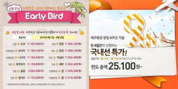 뿐만 아니라 제주항공 창립 9주년을 기념한 국내선 특가도 함께 진행한다. 이번 국내선 특가는 9일부터 9일간 구매가능한 이벤트로, 오는 13일부터 3월 15일까지 출발하는 항공편에 대해 제공되며 편도 총액 2만 5100원부터 제공된다. 단, 설 연휴기간 일부 편은 제외된다.