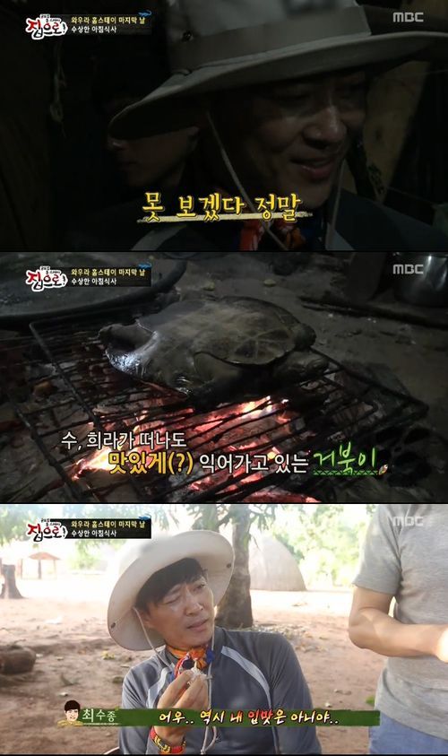 최수종도 결국 나왔다. 최수종은 "거북이 등껍질을 불 위에 올려놨더라. 보고 싶지 않았다. 상상하고 싶지 않다"고 말했다.