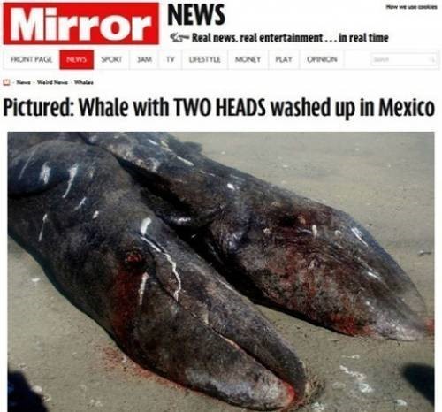 복수의 해외 매체들은 지난 6일(이하 한국시간) 멕시코 북서부 바하칼리포르니아수르주의 석호에서 샴쌍둥이 쇠고래 사체를 발견했다고 일제히 전했다.