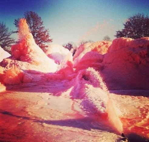 원래 이 분수는 미국 NFL 캔자스시티 치프스 팀의 조형물이다. 팀의 상징색이 붉은색이라 분수도 거기에 맞춰 붉게 물들였는데 최근 미국을 덮친 기상이변 한파로 인해 꽁꽁 얼어붙은 것.