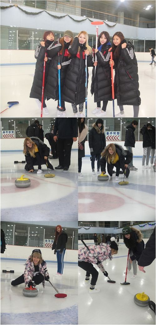 여자 아이돌 스타들이 컬링을 배우느라 여념이 없다.