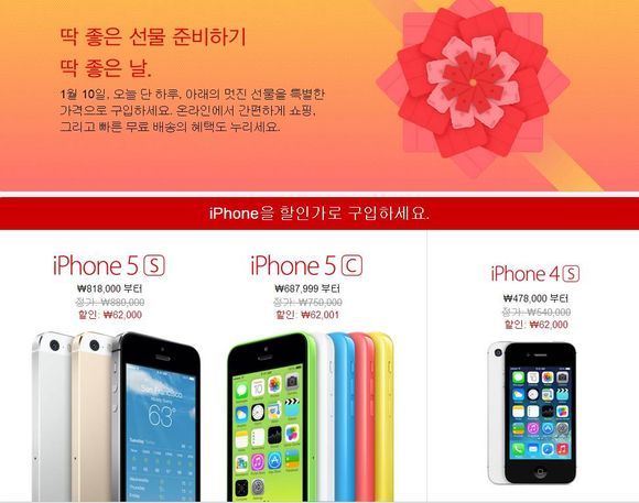 아이폰5s와 아이폰5c의 경우 6만2000원 할인돼 각가 81만8000원, 68만7999원부터 판매된다. 최신제품인 아이패드 미니와 에어의 할인금액은 더 낮다. 레니타 미니 모델의 경우 3만1001원 할인돼 46만8999원부터 구매할 수 있고, 아이패드 에어의 경우 4만6000원 할인돼 57만4000원부터 구입할 수 있다.