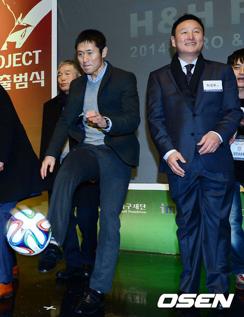 10일 오후 고양 원마운트 스노우파크에서 열린 2014 HERO&HERO Project(H&H 프로젝트) 프렌드쉽 출범식에서 이영표 축구협회 부회장이 브라주카 사인볼을 차고 있다.
