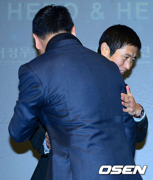 10일 오후 고양 원마운트 스노우파크에서 열린 2014 HERO&HERO Project(H&H 프로젝트) 프렌드쉽 출범식에서 이영표가 허정무 대한축구협회 부회장과 포옹을 하고 있다.