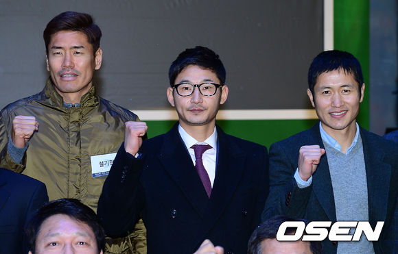 10일 오후 고양 원마운트 스노우파크에서 열린 2014 HERO&HERO Project(H&H 프로젝트) 프렌드쉽 출범식에서 설기현 이천수 이영표가 파이팅을 외치고 있다.