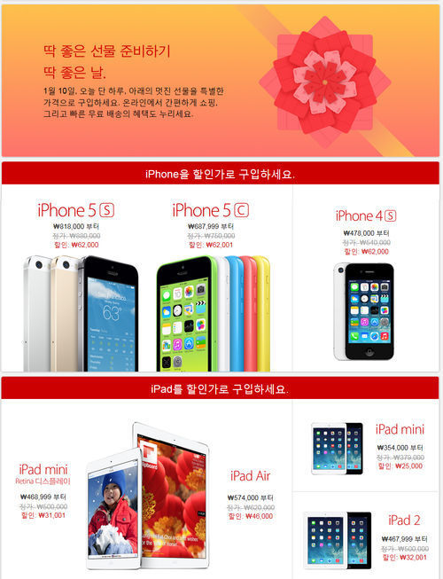 [OSEN=이슈팀] 애플이 10일 애플스토어를 통해 '레드 프라이데이' 행사를 진행하고 있다. 액세서리, 아이폰, 맥북 등을 할인된 가격으로 구입할 수 있는 1년에 하루 뿐인 공식 세일행사기 떄문에 많은 이들의 주목을 받고 있다. 올해 애플스토어의 '레드 프라이데이'에는 아이폰5S와 아이폰5C, 아이패드 레티나 미니, 아이패드 에어 등 신제품도 대거 포함돼 있다. 아이패드 시리즈의 경우 3만원 이상부터, 아이폰의 경우 6만원 이상부터 할인된 가격에 판매되고 있다.
