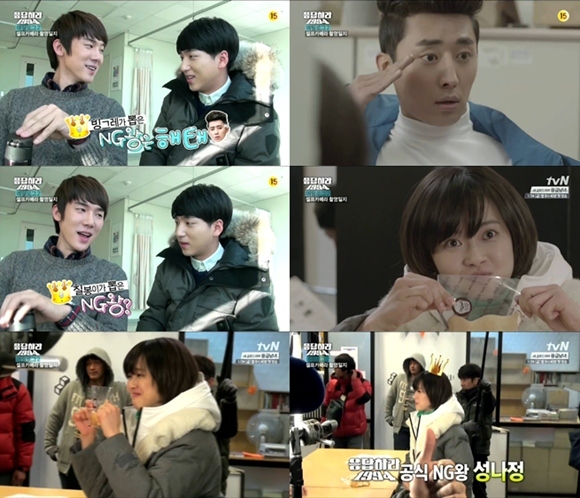 뿐만 아니라 이날 방송에서는 성동일의 국수 '먹방(먹는 방송)'NG, 손호준과 김성균의 목욕탕 장면 NG, 유연석과 고아라의 새해키스 NG 등이 공개됐다.
