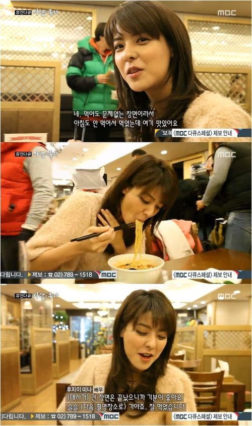 후지이 미나는 11일 방송된 MBC 다큐프로그램 ‘휴먼다큐 사람이 좋다’에서 시트콤 촬영 중에 나온 짬뽕을 먹었다.