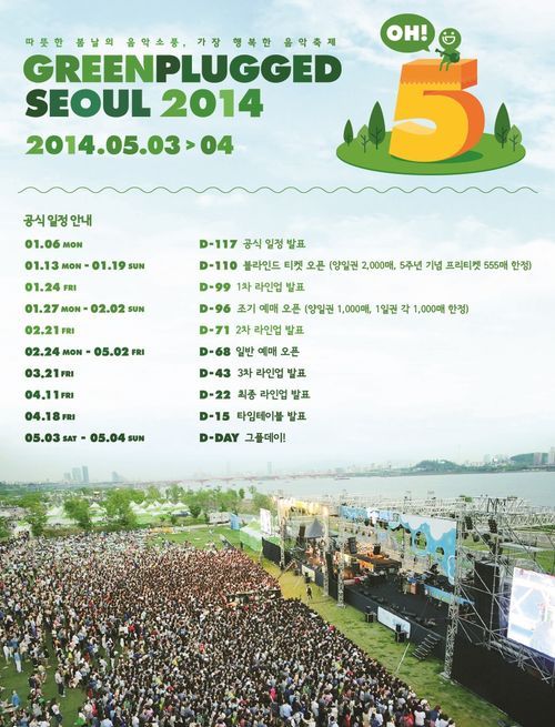 한편 5주년을 맞아 다섯 가지 공약을 내걸며 더욱 다양한 혜택과 즐길 거리를 갖춰가는 ‘그린플러그드 서울 2014’에 대한 상세한 정보는 그린플러그드 공식 사이트와 페이스북 페이지에서 빠르게 확인할 수 있다.
