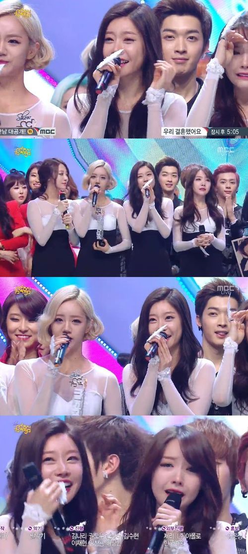 이날 1위 소식에 놀란 멤버들은 전원 눈물을 흘렸고 "너무 감사드린다"며 스태프들과 팬클럽 등의 이름을 끝없이 나열해 훈훈한 웃음을 자아냈다.
