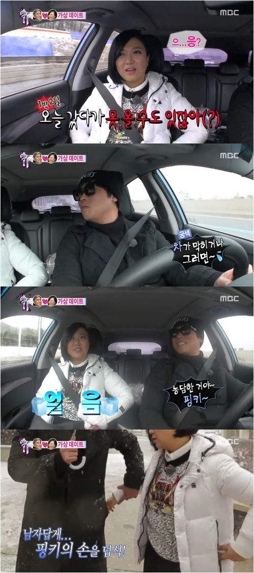 ‘무한도전’ 길이 가상 데이트를 한 김숙에게 1박 2일 여행 흑심을 장난스럽게 드러냈다.