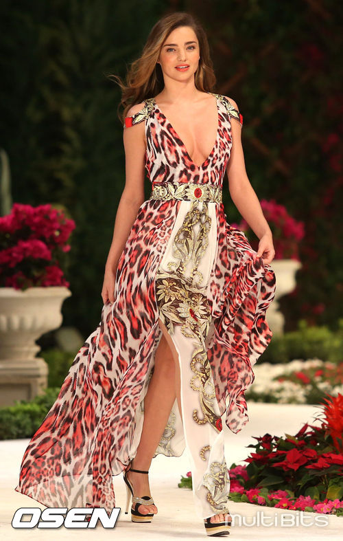 한국 팬들에게 친숙한 세계적 톱 모델 미란다 커가 무대에서 캣 워크를 하고 있다.