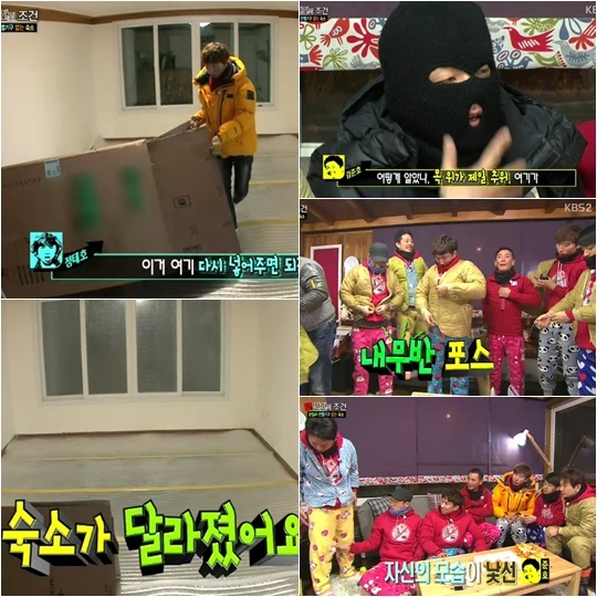 지난 11일 방송된 KBS 2TV 예능프로그램 '인간의 조건'에서는 난방비 제로에 도전하는 멤버들(박성호 김준호 정태호 허경환 양상국 김준현)의 모습이 그려졌다.