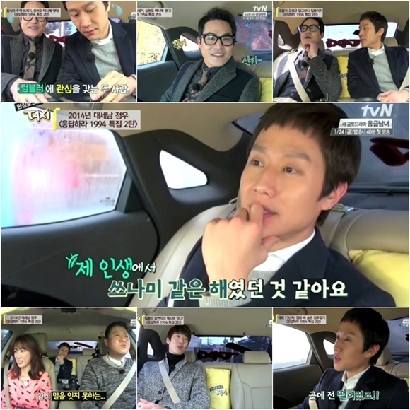 지난 11일 오후 방송된 tvN '현장토크쇼 택시'(이하 택시)에는 '응답하라 1994'에서 쓰레기 역으로 열연했던 정우와 삼천포 역의 김성균이 출연해 재치 있는 입담을 뽐냈다. 두 사람은 드라마 비하인드 스토리부터 인기 정상의 배우가 되기까지의 과정과 에피소드 등을 공개했다. '응답하라 1994'의 캐릭터 그대로인 것 같으면서도 또 다른 매력을 지난 정우의 모습에 시청자들의 관심이 쏠렸다.