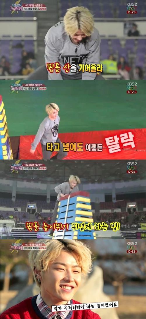 블락비 유권이 뜀틀 높이뛰기 경기에서 귀여운 포즈로 탈락했다.