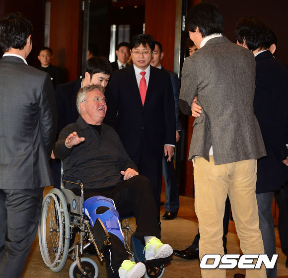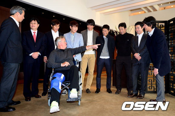 휠체어에 앉은 히딩크가 등장하자 제자들이 반가운 얼굴로 안부를 물었다. 다행히 상태는 좋아보였다. 히딩크는 역전의 용사들과 가벼운 농담을 주고받은 뒤 취재진과의 인터뷰에 응했다.