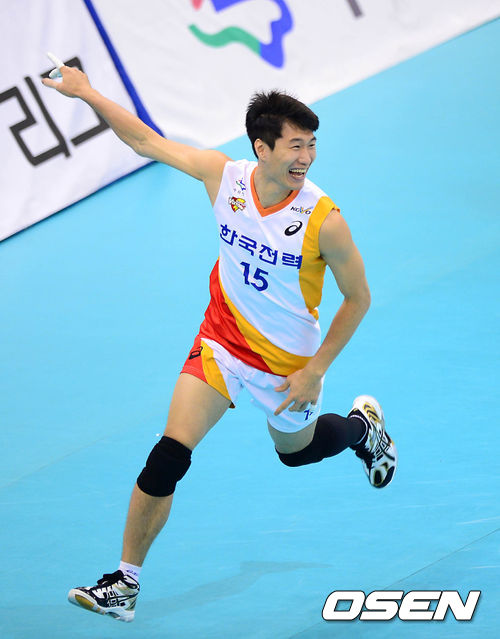2세트 블로킹에 성공한 한국전력 김진만이 환호하고 있다.