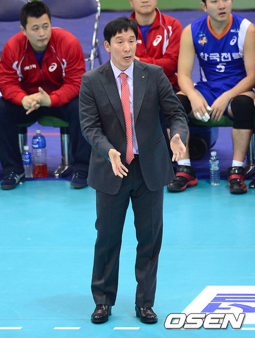 2세트 한국전력 신영철 감독이 선수들에게 작전을 지시하고 있다.