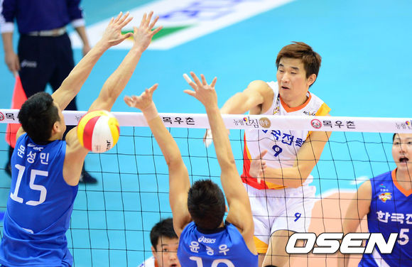 2세트 한국전력 최석기가 현대캐피탈의 블로킹 벽을 피해 공격을 시도하고 있다.