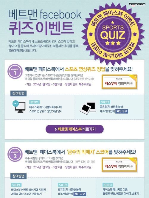 먼저 '스포츠 연상퀴즈 이벤트'는 베트맨 공식 페이스북(www.facebook.com/withbetman)을 방문해 이벤트 페이지에서 제시하는 그림에서 연상되는 스포츠와 관련된 단어를 댓글을 달고 공유하기 버튼을 눌러 자신의 타임라인에 사진을 공유하는 방식으로 진행된다. 추첨을 통해 매주 정답을 맞힌 5명의 회원에게는 맥스무비 영화예매권(1인 2매)을 증정한다.