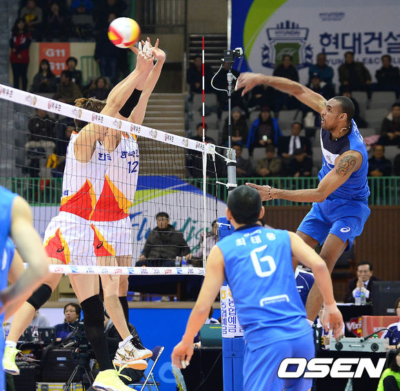4세트 현대캐피탈 아가메즈가 한국전력의 블로킹 벽을 피해 공격을 시도하고 있다.