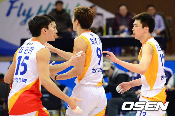 4세트 득점에 성공한 한국전력 선수들이 환호하고 있다.