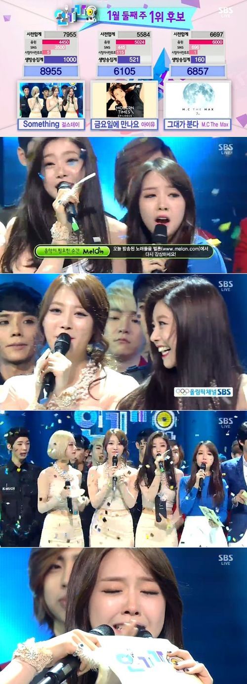 걸스데이는 12일 오후 방송된 SBS '인기가요'에서 1위 후보였던 아이유, 엠씨더맥스를 제치고 '섬씽'으로 1위 왕좌를 거머쥐었다. 이는 컴백 후 MBC뮤직 '쇼챔피언', MBC '쇼!음악중심'에 이어 3번째의 1위다.