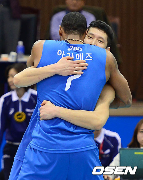 경기 종료 후 현대캐피탈 문성민과 아가메즈가 승리의 기쁨을 나누고 있다./sunday@osen.co.kr