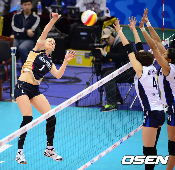 2세트 현대건설 바샤가 IBK기업은행의 블로킹 벽을 피해 공격을 시도하고 있다./sunday@osen.co.kr