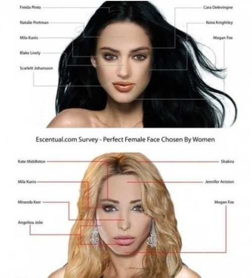 '남녀가 생각하는 미인'에 따르면 남성과 여성의 미인 기준은 확연한 차이를 보인다. 샤키라의 금발, 제니퍼 애니스톤의 이마, 밀라 쿠니스의 눈, 미란다 커의 코, 안젤리나 졸리의 입술과 광대뼈를 선호하는 남성과 달리 여성은 프리다 핀토의 흑발과 나탈리 포트만의 이마, 블레이크 라이블리의 코와 스칼렛 요한슨의 입술을 선호하는 것으로 알려졌다.