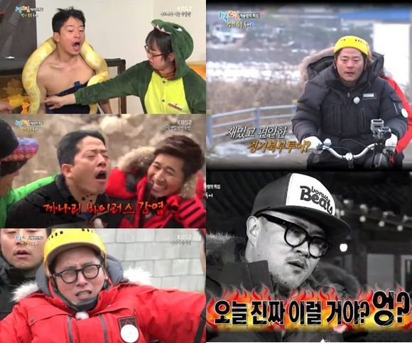 빙벽을 통해 팔의 힘을 모두 쓴 멤버들 앞에는 3인용 자전거가 주어졌다. 경기도 북부 지역에서 흔히 즐기는 레저 스포츠라는 자전거는 멤버들에게는 그저 또 하나의 벌칙이었다. 이 역시 제작진의 독한 노림수였다. 차태현은 "우리가 오늘 뭐 잘못했느냐"며 볼멘소리를 내기도 했지만 멤버들의 원성이 높아질 수록 시청자들의 재미 역시 높아져 갔다.