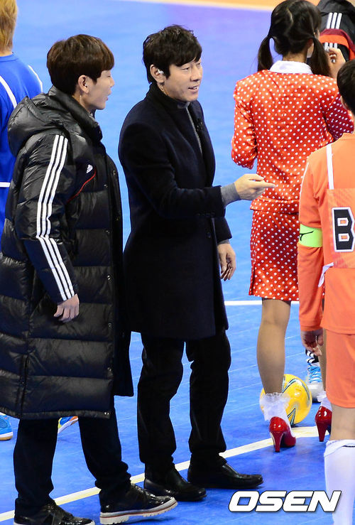 13일 오전 서울 잠실 학생체육관에서 열린 MBC '아이돌스타 육상 양궁 풋살 컬링 선수권 대회'(이하 '아육대')현장공개에서 신태용 감독이 송종국과 이야기를 나누고 있다.