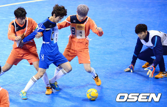 13일 오전 서울 잠실 학생체육관에서 열린 MBC '아이돌스타 육상 양궁 풋살 컬링 선수권 대회'(이하 '아육대')현장공개에서 에이젝스 효준이 골문앞에서 슛을 하려 하고 있다.