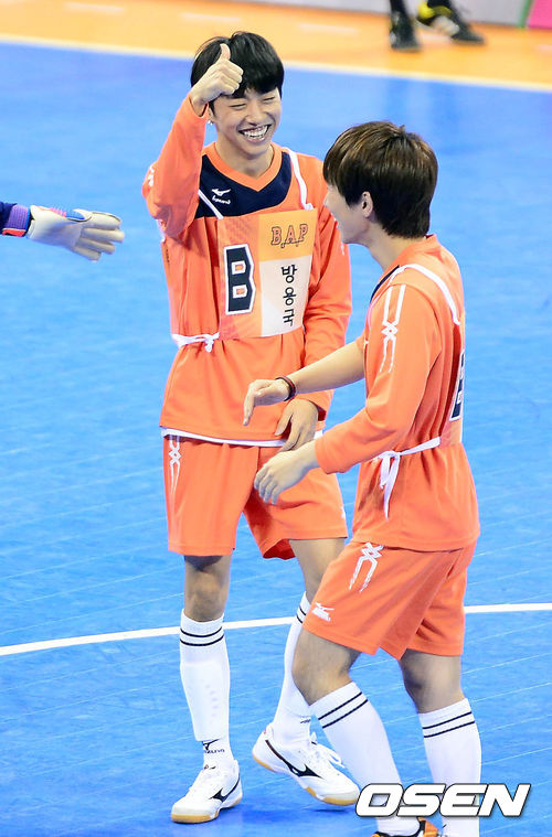 13일 오전 서울 잠실 학생체육관에서 열린 MBC '아이돌스타 육상 양궁 풋살 컬링 선수권 대회'(이하 '아육대')현장공개에서 방용국이 골을 넣고 기뻐하고 있다.