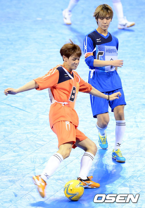 13일 오전 서울 잠실 학생체육관에서 열린 MBC '아이돌스타 육상 양궁 풋살 컬링 선수권 대회'(이하 '아육대')현장공개에서 양요섭이 슛을 하고 있다.