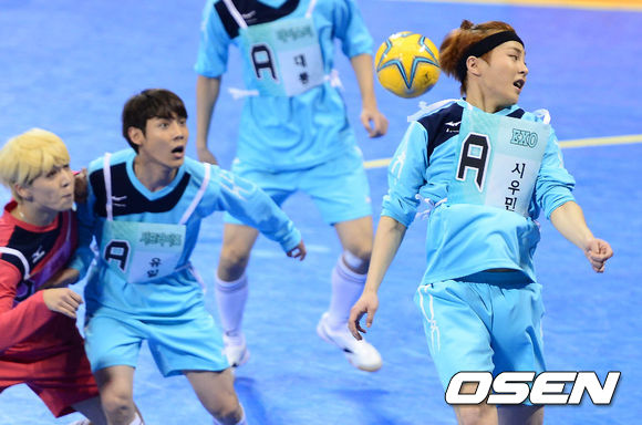 13일 오전 서울 잠실 학생체육관에서 열린 MBC '아이돌스타 육상 양궁 풋살 컬링 선수권 대회'(이하 '아육대')현장공개에서 엑소 시우민이 헤딩을 시도하고 있다.