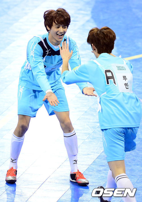 13일 오전 서울 잠실 학생체육관에서 열린 MBC '아이돌스타 육상 양궁 풋살 컬링 선수권 대회'(이하 '아육대')현장공개에서 샤이니 민호와 엑소 루한이 하이파이브를 하고 있다.