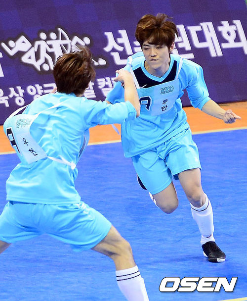 13일 오전 서울 잠실 학생체육관에서 열린 MBC '아이돌스타 육상 양궁 풋살 컬링 선수권 대회'(이하 '아육대')현장공개에서 엑소 루한이 골을 넣고 기뻐하고 있다.