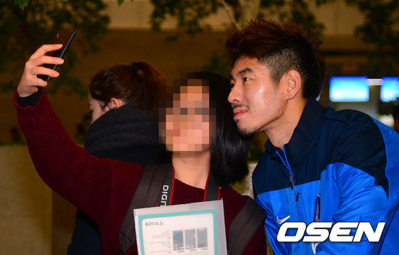 하대성이 여성팬과 기념촬영을 하고 있다.