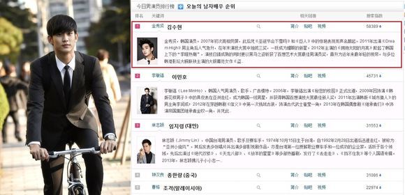 중국 최대 검색 포털사이트인 ‘바이두’에서 꼽은 ‘오늘의 남자 배우 부문’(1월 14일 기준)에서 김수현이 1위를 차지하며 높은 인기를 입증했다. 해당 차트는 최근 중화권에서 인기 급상승 중인 아티스트들의 순위를 매긴 것으로, ‘상속자들’의 이민호, 대만의 톱스타 임지령이 김수현의 뒤를 잇고 있어 더욱 눈길을 끈다.