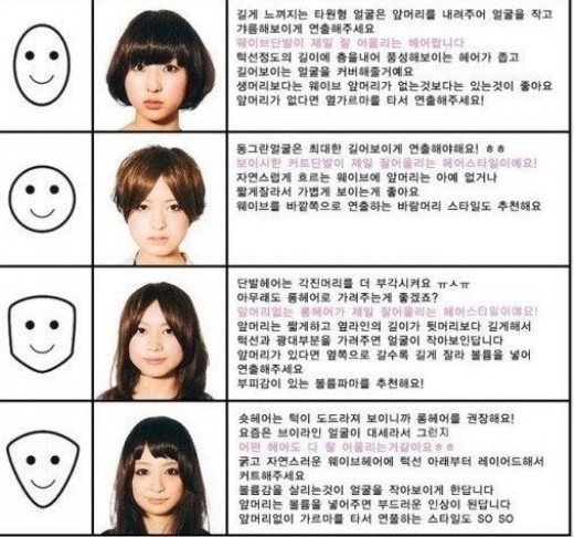 둥근얼굴은 최대한 길어 보이는 헤어스타일로 연출하는 보이시한 커트단발로, 턱이 각지고 정사각형 얼굴은 앞머리는 짧게하고 옆라인의 길이가 뒷머리보다 길게, 넓은 이마에 뾰족한 턱을 가진 '역삼각형' 얼굴은 풍성하고 볼륨감 있는 헤어스타일이 잘 어울리는 것으로 나타났다.