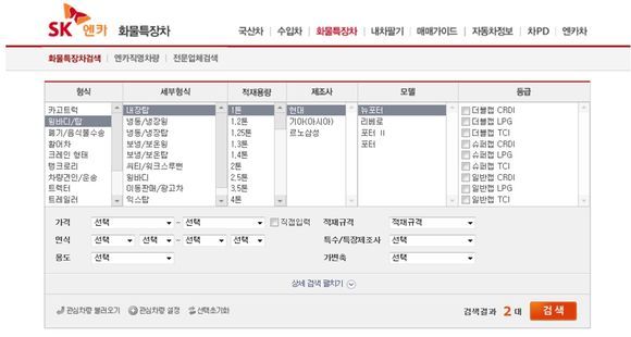 '중고 화물특장차 전용 서비스'는 제조사, 모델, 등급, 가격, 연식, 주행거리, 연료, 변속기 등 일반적인 조건 외에도 특수한 차량 형식, 적재용량, 적재규격, 특수·특장제조사, 가변축 등 다양한 세부 사항들을 설정해 찾고자 하는 화물특장차를 한 번에 검색할 수 있다.