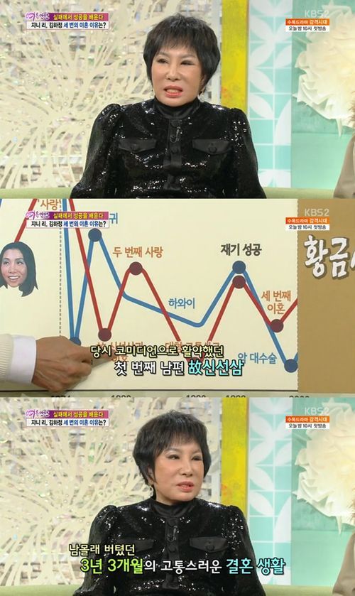 김하정은 15일 방송된 KBS 2TV ‘여유만만’에서 세 번의 이혼 경험과 첫 번째 남편인 개그맨 고(故) 신선삼과 이혼한 이유를 전했다.