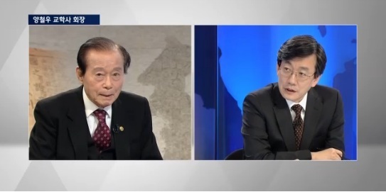 양 회장은 14일 JTBC ‘뉴스9’에 출연해 교학사 교과서의 채택률이 낮아진 이유에 대해 손석희 앵커가 질문하자 이에 관한 대답을 하다가 막말을 던진 것.