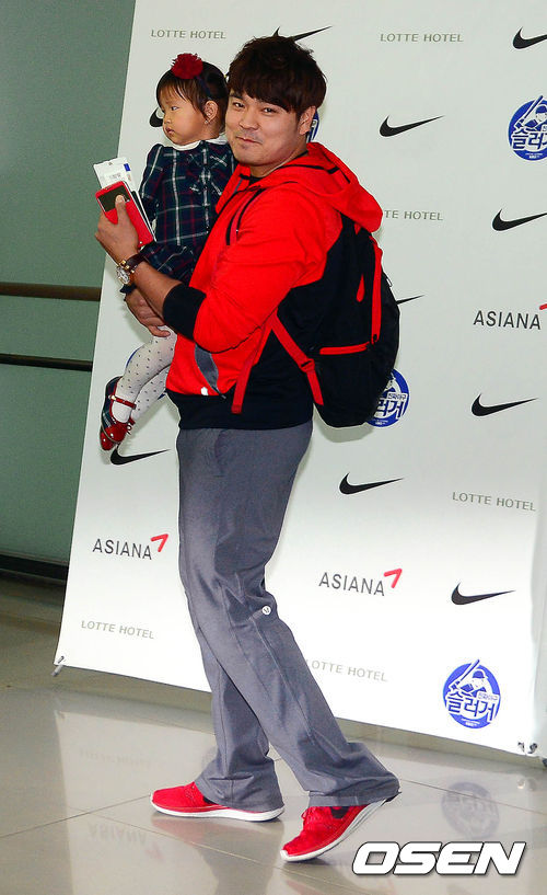 추신수가 딸 추소희와 출국장으로 들어서고 있다.