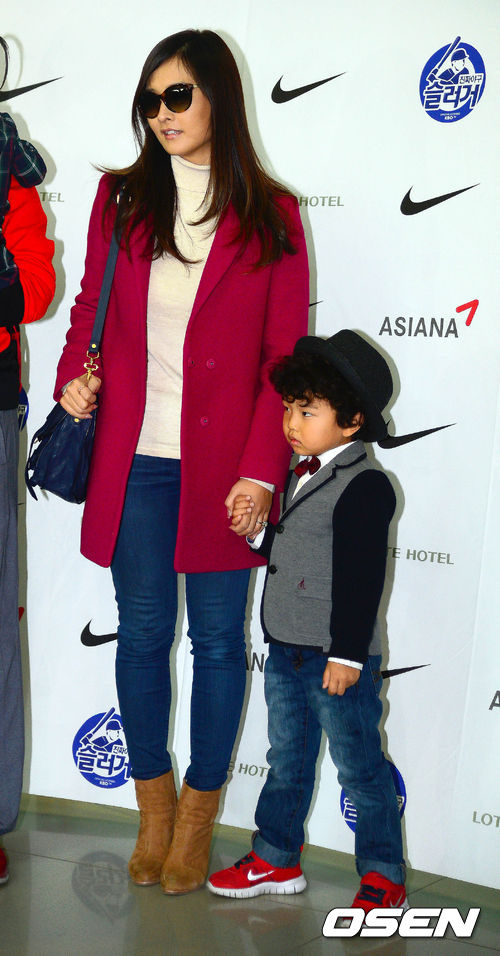 추신수 아내 하원미씨와 아들 추건우가 포토타임을 갖고 있다.