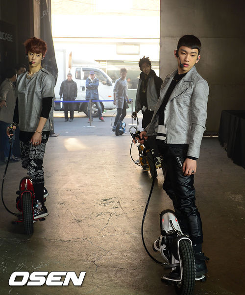 15일 오후 서울 성수동 대림창고에서 'Garage Showcase'라는 타이틀로 열린 JYP가 최초의 힙합그룹 갓세븐(GOT7)의 데뷔 쇼케이스에서 갓세븐 멤버들이 스텐딩 바이크를 타고 입장하고 있다.