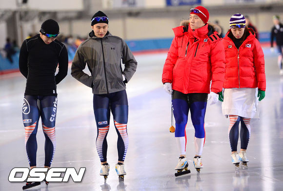 15일 오후 서울 태릉선수촌 국제스케이트장 내 기자회견장에 열린 '2014 소치 동계올림픽' 빙상국가대표선수단 미디어 데이 행사에서 스피드스케이팅 팀 이상화와 모태범이 연습을 하고 있다.